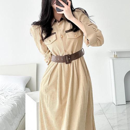 [옷자락] [시즌오프]봄 청순 앤틱 가죽 배색 코듀로이 롱원피스_5