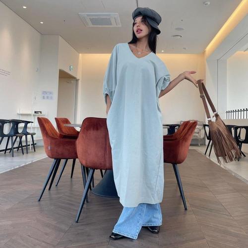 DEARHUA 1+1 여성 린넨 브이넥 박스 맥시 시원한 원피스 봄 여름 빅사이즈 추천 반팔 무지 오버핏 V넥 얇은 더위 흡수 통기성 면 마 디자인 세련 스타일 휴양지 롱 원피스