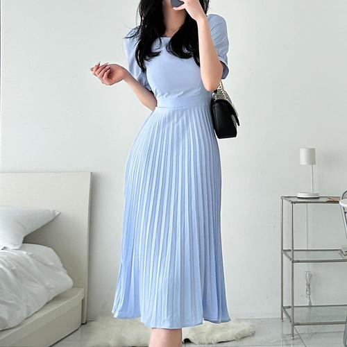[옷자락] [시즌오프]봄 여름 블루 옐로우 퍼프 소매 플리츠 롱원피스_5