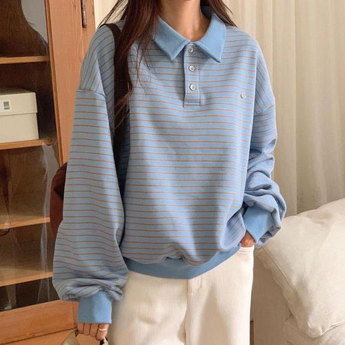 [문에이블]문에이블 여자 여성 가을 봄 루즈핏 스트라이프 단가라 단추 카라 데일리룩 긴팔 맨투맨