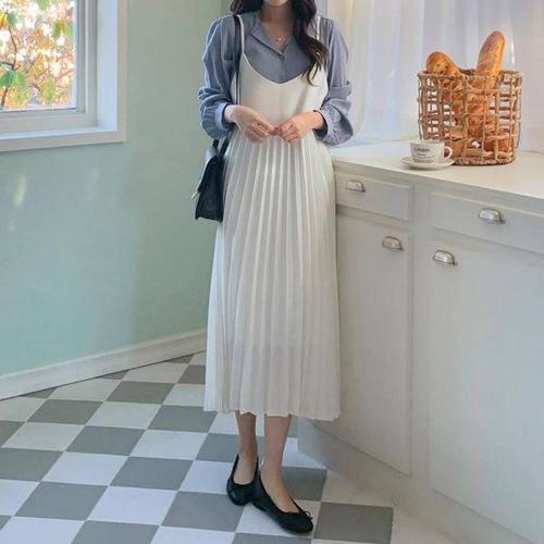 아피나르 여성용 겨울 플리츠 뷔스티에 롱원피스