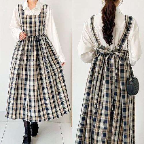 끈조절 뷔스티에 오버핏 체크 롱원피스