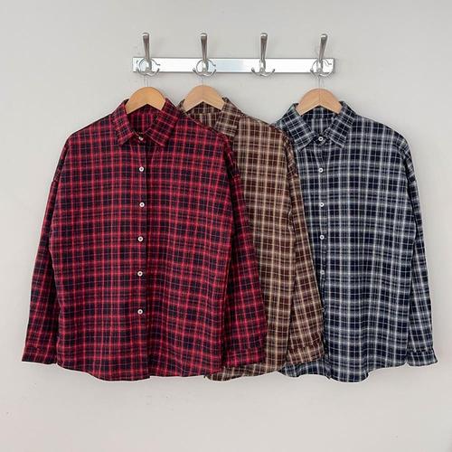 [옷자락] 여성 브라운 체크 긴팔 셔츠 가을 캠퍼스 스타일 루즈핏