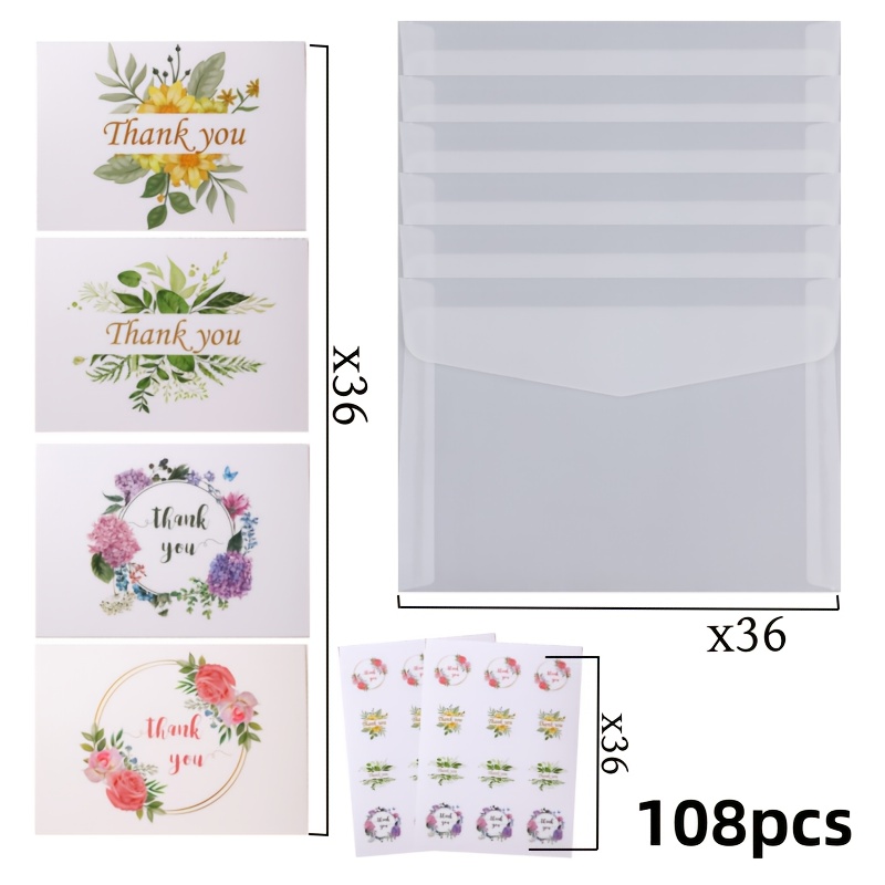 TEMU 108개 투명 무광 황산지 봉투 + 4종 감사카드 세트, 직사각형 플립 커버 투명 봉투, 6.29x4.52인치, 소형 선물, 카드, 초대장용