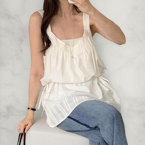 [옷자락]여자 루즈핏 나시 힙커버 리본 브이넥 블라우스