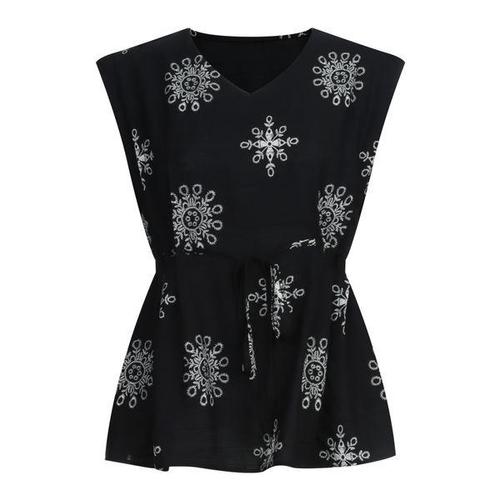[샵앤]여성 브이넥 나염 빈티지 허리끈 민소매 블라우스 NTT-WBL-20755-블랙