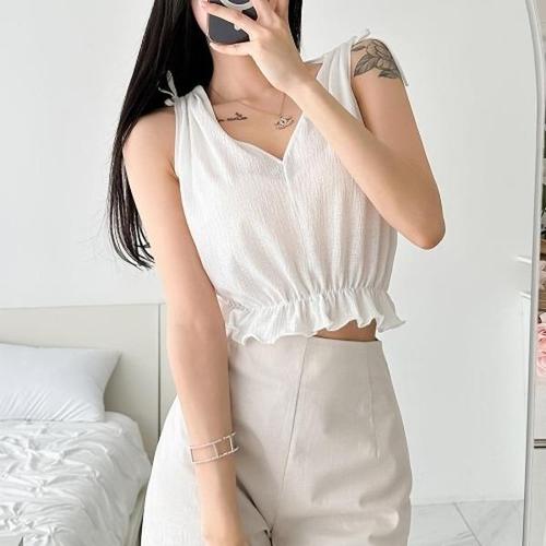 [다잇템][다잇템] 여자 슬리브리스 V넥 블라우스 탱크 드로우코드 프릴 티셔츠_14411068_588872