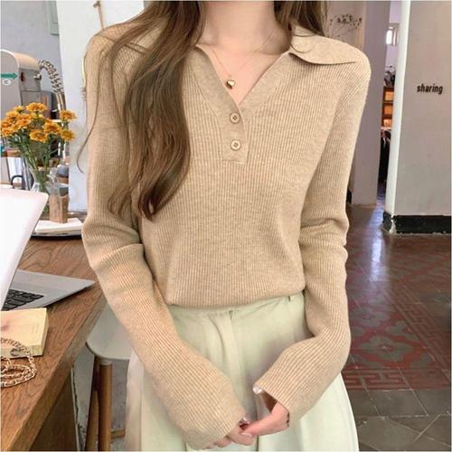 카라 브이넥 골지니트 버튼티 니트 여성 여리여리 슬림핏 3색 WFKXMFB