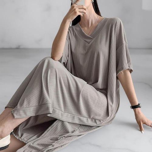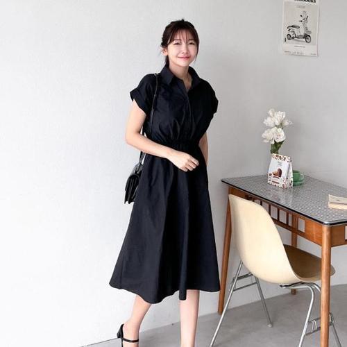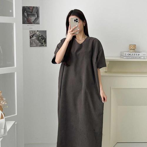 [옷자락] 여자 여름 브이넥 셔츠 롱 반팔 원피스
