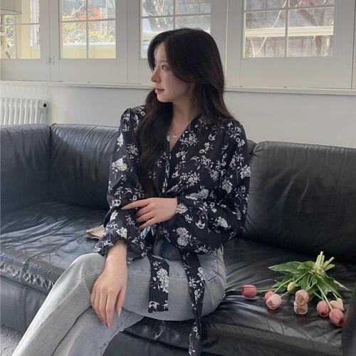 [다잇템_패션]여성 박시핏 롱슬리브 V넥 꽃무늬 블라우스
