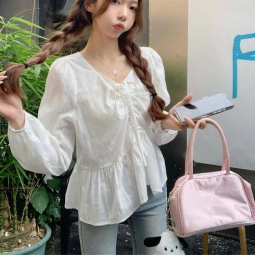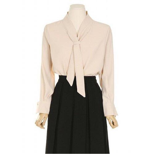 [옷자락]여자 잔주름 V넥 롱슬리브 리본보우 에이라인 블라우스