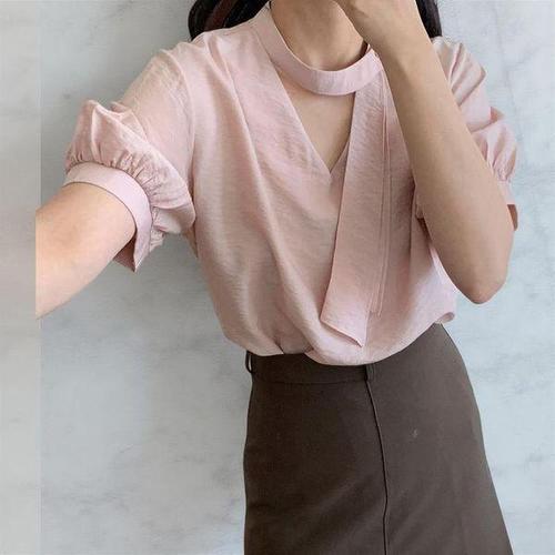 여자 분홍 퍼프반팔 브이넥 롱타이 블라우스