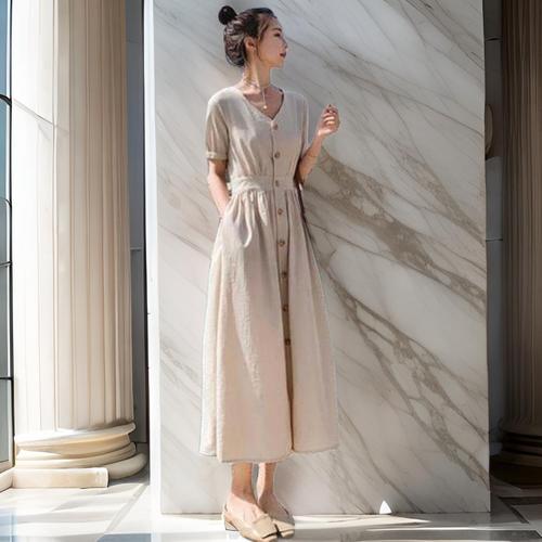 [보니제이]퍼프소매 허리라인 V넥 반소매 롱원피스 미니단추 체