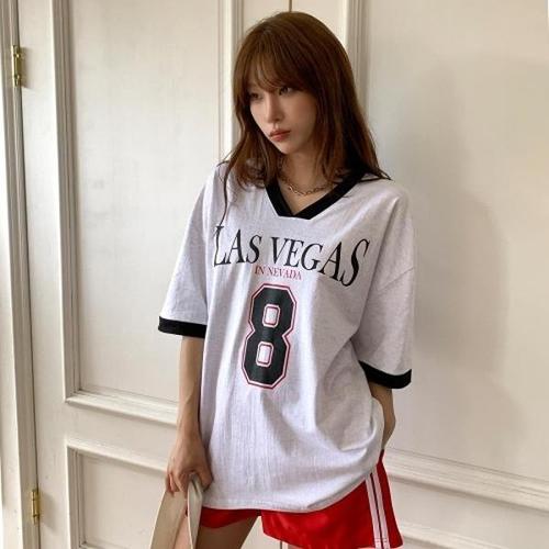 [신상오픈런]여자 데일리 배색 브이넥 레터링 루즈핏 반팔티