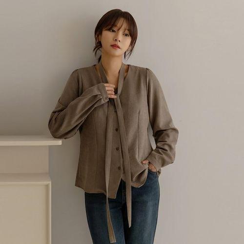 샵앤) 여성 V 카라넥 날씬한 핀턱 셔링 간절기 블라우스 셔츠 CAT-WBL-4161-베이지