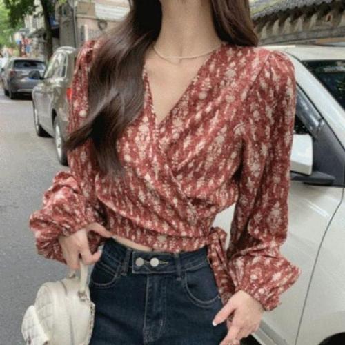 [에이치플러스몰]플로럴패턴슬림 여성 퍼프 리본블라우스