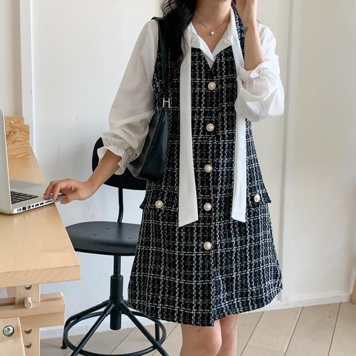 여자 트위드 민소매 원피스 블라우스 세트