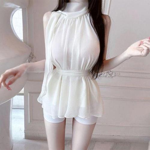 [에이치플러스몰]여성 홀터넥 셔링 민소매 블라우스 여름용