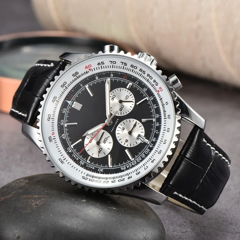 풀 기능 크로노그래프 라운드 가죽 스트랩 남성용 42mm 쿼츠 스포츠 시계