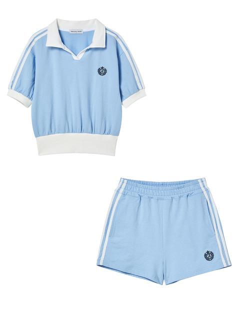 [어썸스튜디오] [SET] 스포티 배색 카라 반팔 + 라인 배색 쇼츠 스카이블루