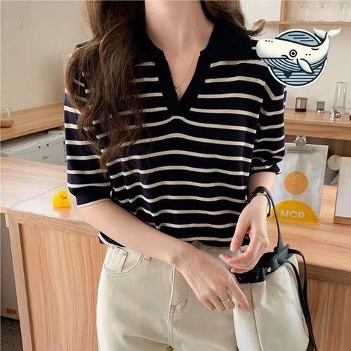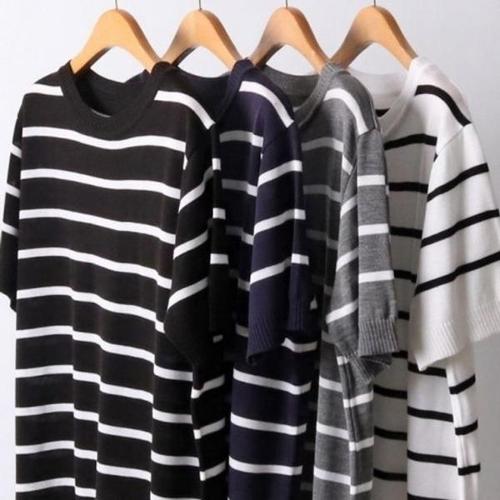 [에이치플러스몰]여성 스트라이프 반팔 니트 티 여름 빅카라