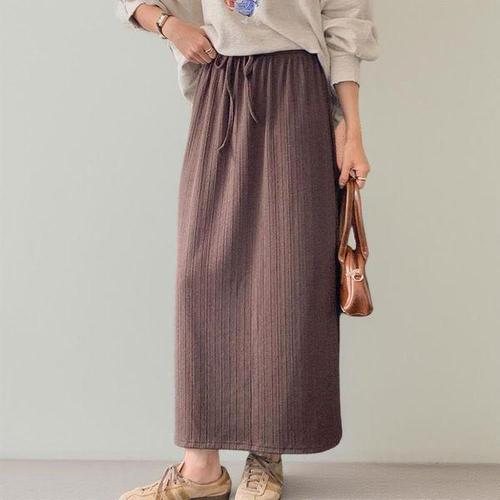 [미라클세븐]여성 골지 롱스커트 빅사이즈 뒤트임 리본 밴딩