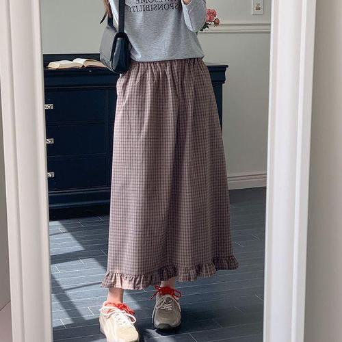 [신상오픈런]여성 체크 패턴 프릴 롱 스커트 빅사이즈 A라인