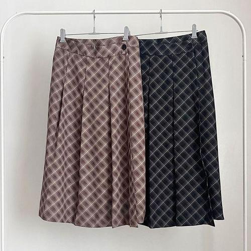 [옷자락] 여성 체크 패턴 랩형 플리츠 롱스커트 빅사이즈 뒷밴딩