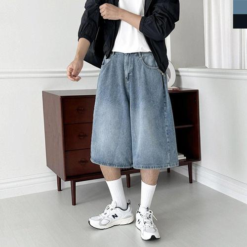 남성 힙한 빅사이즈 옆핀턱 와이드 뒷밴딩 버뮤다 데님 반바지 WFJ0J6N