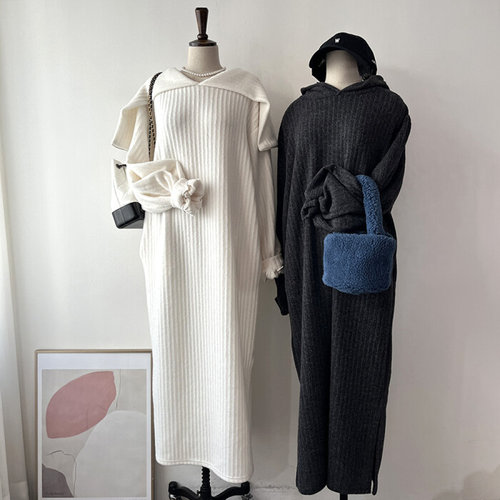 에르디테 / 빅사이즈 오버핏 빅 카라 후드 넥 니트 맥시 롱 원피