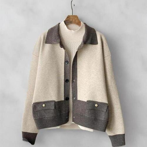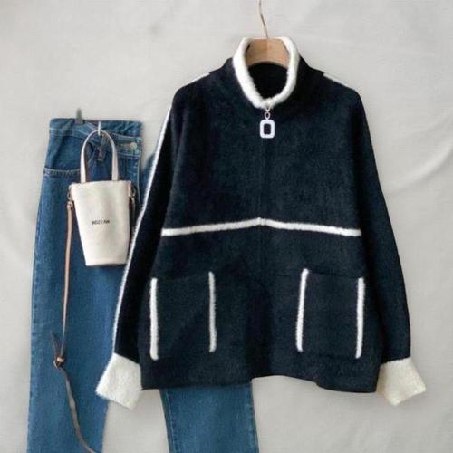 [신상오픈런]여성 배색 카라넥 빅포켓 니트 집업 가디건 대형 사이즈