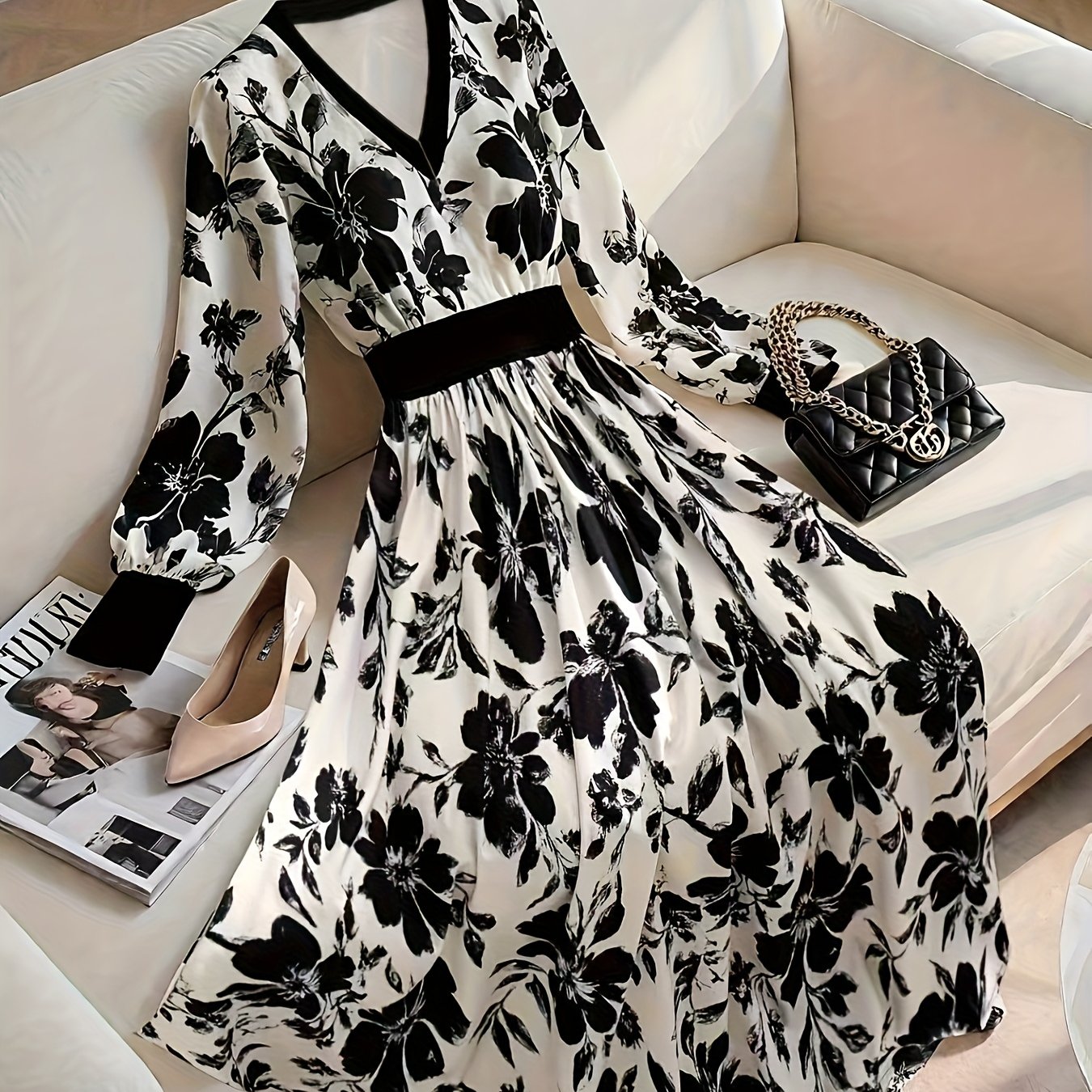 TEMU 우아한 V넥 A라인 드레스 - 허리라인 & 긴 소매, 웨딩, 교회, 비즈니스용 미드 길이 플레어 헴 드레스 - 세탁기 사용 가능, 사계절 착용 (LL168) - 논스트레치 프로페셔널 의상