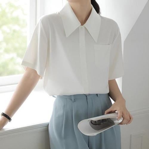 [엄지척]여성 베이직 반팔 셔츠 빅카라 무지 블라우스_19651139_667501