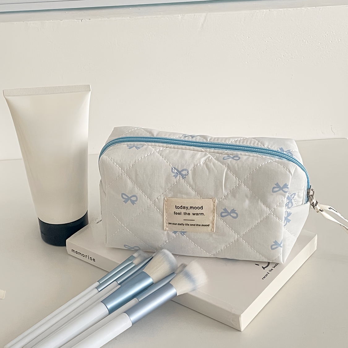 TEMU 리본 프린트 소프트 퀼팅 세면도구 가방, 고급스러운 대비되는 색상, 달콤하고 심플한 니치 디자인, 지퍼형 스타일, 대용량 메이크업 액세서리, 일상 또는 여행 시 소품 수납에 적합한 휴대용 수납 파우치. 스타일리시하고 예쁜 핸드헬드 세면도구 여행용 가방, 집이나 외출 시 바쁜 여성들을 위한 필수품