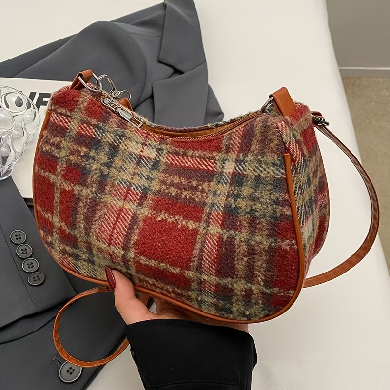 TEMU 여성용 트위드 크로스바디 백 - 우아한 레드 & 브라운 체크무늬 지퍼 클로저, 구조적 숄더백, 일상 및 정장용, 커피 브라운/레드/블루, 내구성 있고 쉬운 세척 유지보수, 다용도 핸드백, 시크 액세서리, 고품질 마감, 컴팩트 핸드백, 패션 애호가용, 여성용 체크무늬 가방, 레드 체크무늬 퍼스