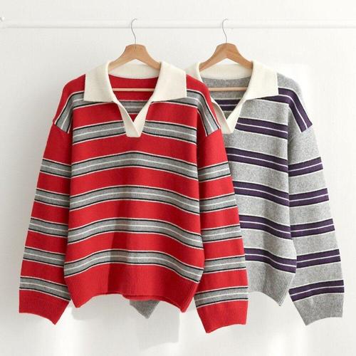 [다잇템]여자 줄무늬 FW 럭비티 빨간 콘트라스트 니트