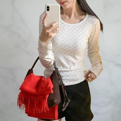 [다잇템][다잇템] 여성 편한 롱슬리브 U넥 땡땡이 티셔츠 슬림핏 빨간 티_24228431_588872