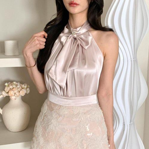 [신세계라이브쇼핑][옷자락] 여자 새틴 리본 롱타이 큐빅브로치 민소매 블라우스