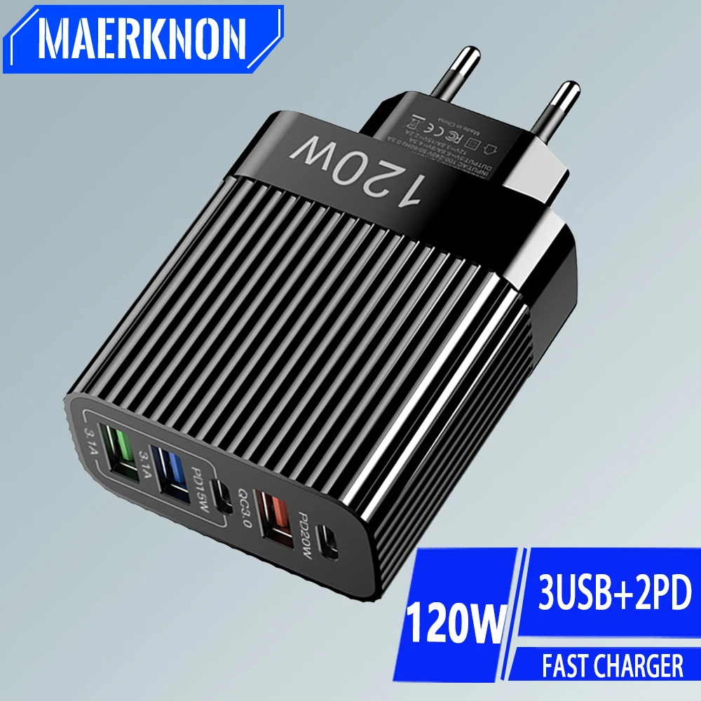 총 120W USB 충전기, 5 포트 C 타입 고속 충전, 휴대폰 벽 어댑터, EU, US, UK 플러그, 아이폰 15, 삼성, 샤오미, 화웨이용