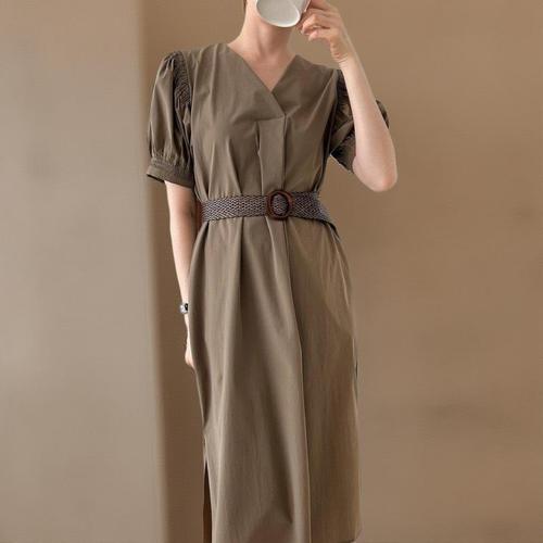 [미라클세븐]여성용 클래식 라운드 벨트 퍼프 슬리브 반팔 트임 롱 드레스
