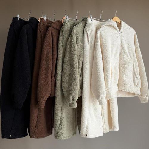 [미라클세븐]여성용 겨울 양털 후드 집업과 루즈핏 와이드팬츠 세트