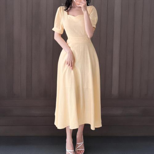 [미라클세븐]여성 하트넥 어깨 퍼프 뒷지퍼 허리 끈 롱 드레스