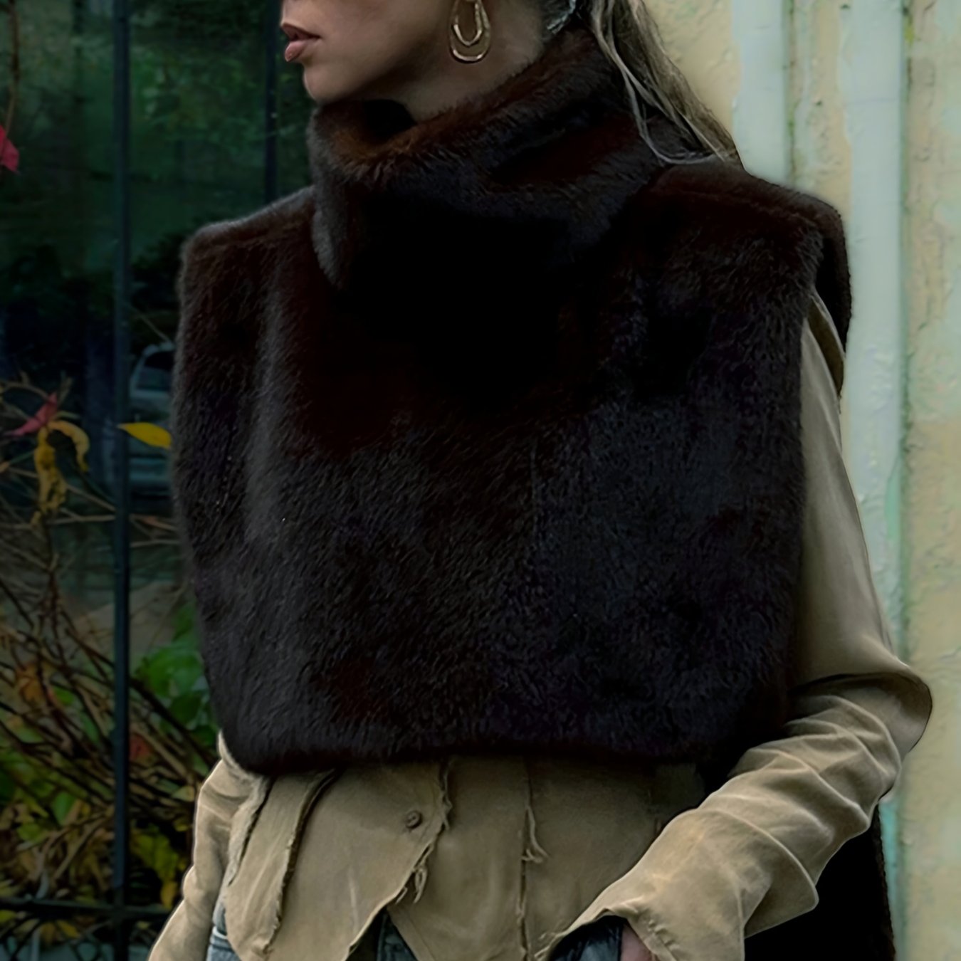 TEMU 우아하고 트렌디한 하이넥 인조 모피 조끼 | 단색, 대비되는 디테일, 가을/겨울에 적합, 외출복으로 이상적