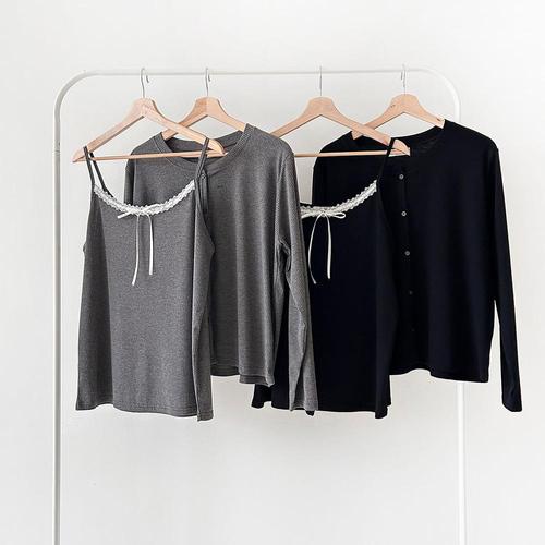[옷자락] 여성 레이스 배색 리본 나시 가디건 세트
