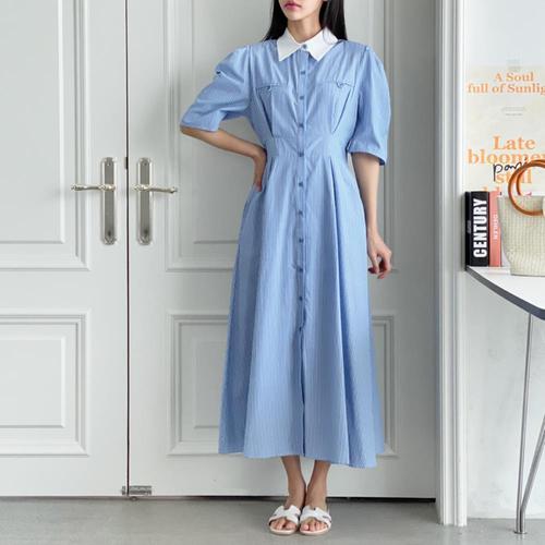 [옷자락] [시즌오프]여름 페미닌 포멀룩 퍼프 셔링 셔츠 롱원피스_5