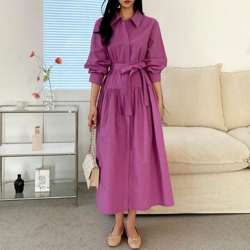[애비뉴투지]엄마옷 셔츠 카라 메탈 버튼 캉캉 여성 봄 가을 긴팔 롱 허리끈 주머니 원피스 K04438