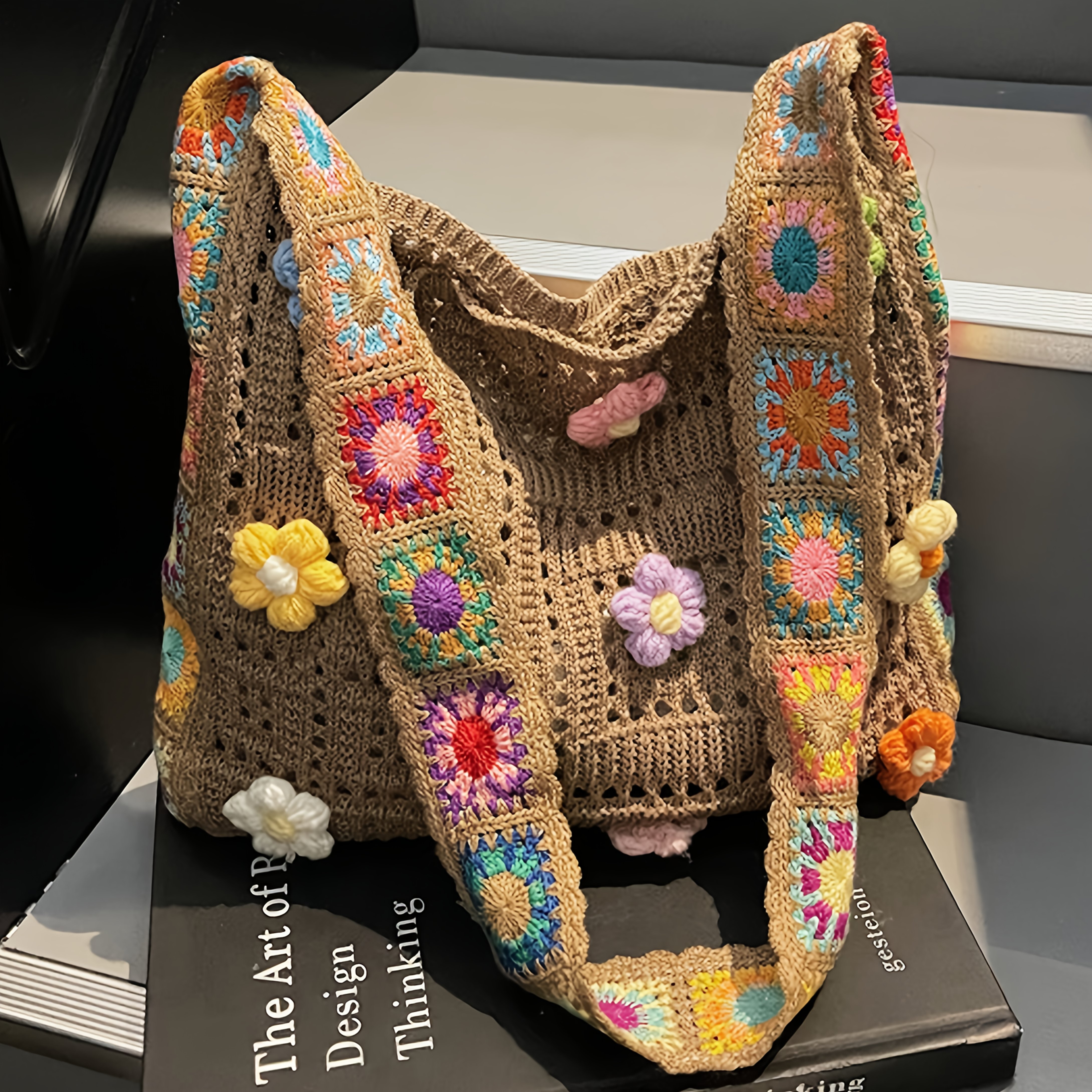 TEMU 스타일 대용량 토트백, 패셔너블한 플로럴 크로셰 핸드백 (꽃 색상 및 위치는 랜덤), 멀티 컬러 할로우 니트 숄더백, 할로우 여성용 컬러풀 플로럴 크로스바디 백, 여름 해변 레저 바캉스에 적합