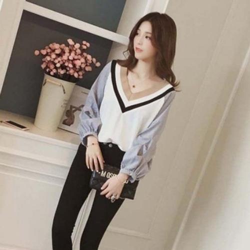 [엄지척]깊은 브이넥 줄무늬 퍼프소매 데이트룩 여사친룩 코디_19642678_667501
