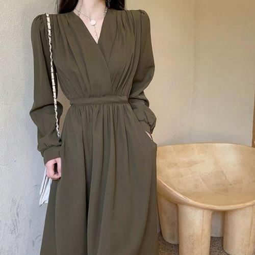 프렌치 여성 롱원피스 캐주얼 퍼프소매 브이넥 머메이드 원피스 데일리 여자 하객룩 반팔 원피스 YSQ