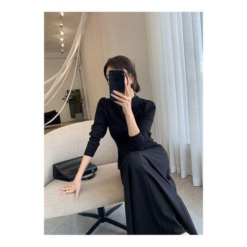 [에이치플러스몰]우아한 하이넥 퍼프소매 블랙 롱원피스 세련된 데일리룩
